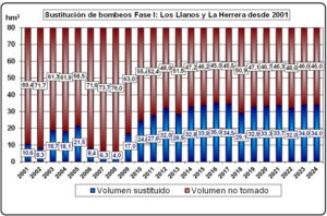 A fecha de hoy se encuentra ejecutada una PRIMERA FASE de esta actuación general en la zona de Los Llanos de Albacete y La Herrera, que, como fase concluida, operativa desde 2001, deriva anualmente hasta 35 hm3, en 2024 se han tomado 34 hm3, equivalente al 43 % del total de 80 hm3 asignados.