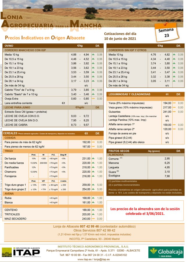 Cotizaciones de la Lonja de Albacete de 10-06-2021.