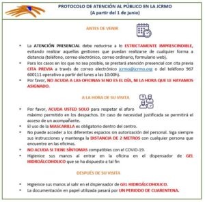 Albacete pasa a la fase 2 el próximo lunes 1 de junio, por tanto, es razonable, empezar la ATENCIÓN PRESENCIAL en las oficinas de la JCRMO, CON CITA PREVIA, siempre cumpliendo las normas sanitarias para velar por la salud de todos.